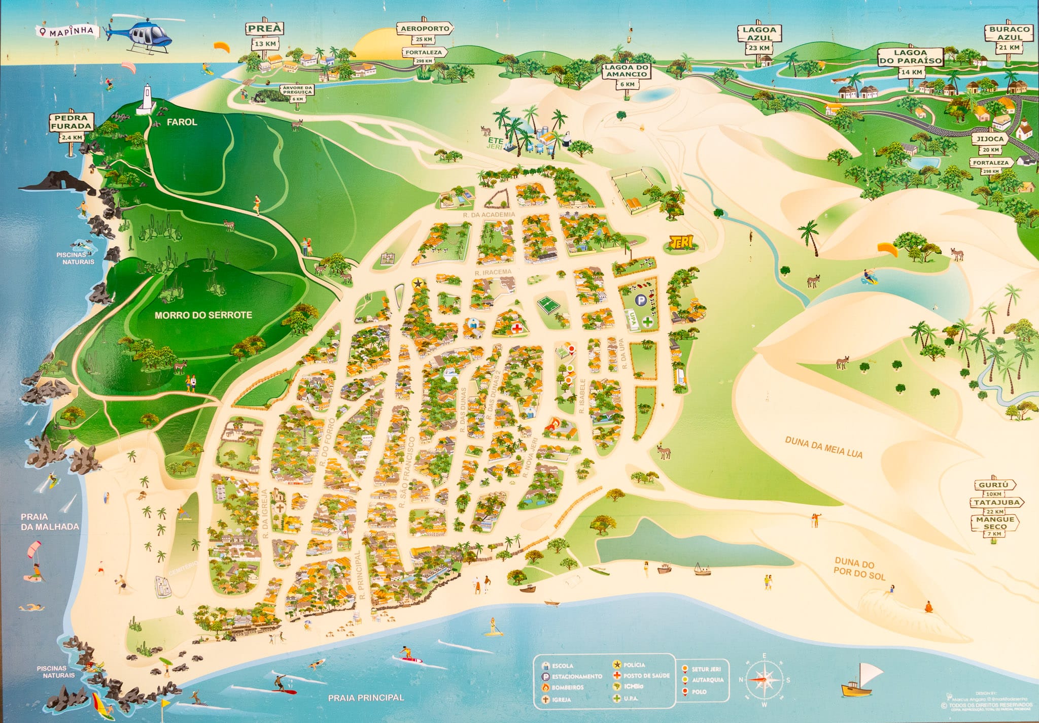 When you look at a Jericoacoara map, you’ll notice how isolated it is. The village is squeezed between the Atlantic Ocean and big sand dunes, with sandy streets instead of asphalt. That isolation is exactly what gives the town its slow pace and “end of the world” feel.
