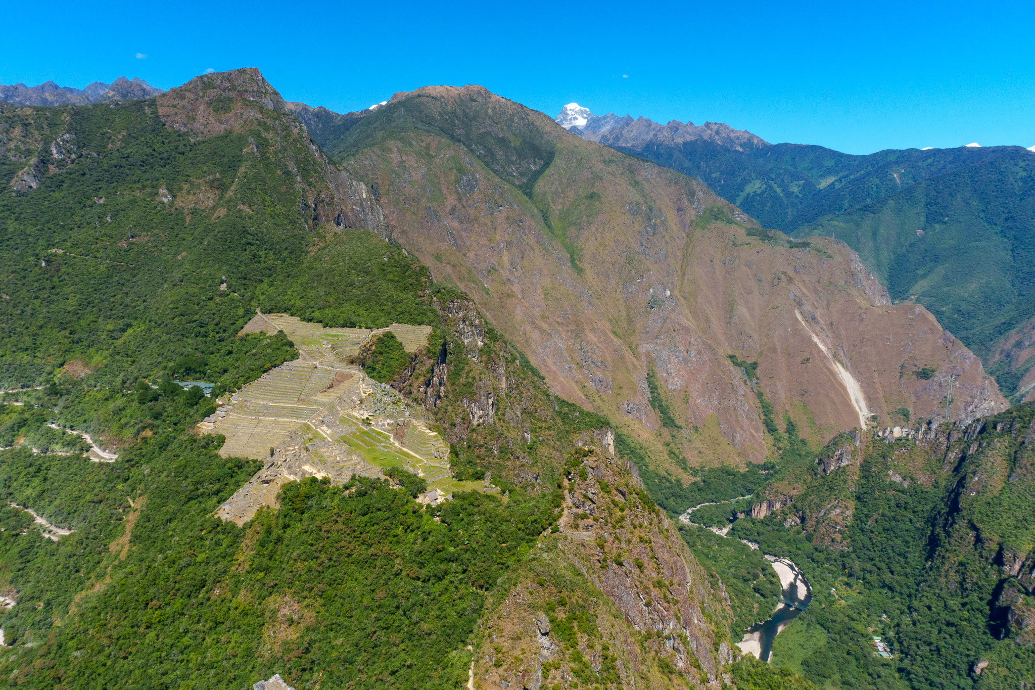 Machu Picchu lies in the eastern Peruvian Andes, above the Urubamba River valley. The closest town is Aguas Calientes (also called Machu Picchu Pueblo), reached by train, bus, or trekking from Cusco or Ollantaytambo.
